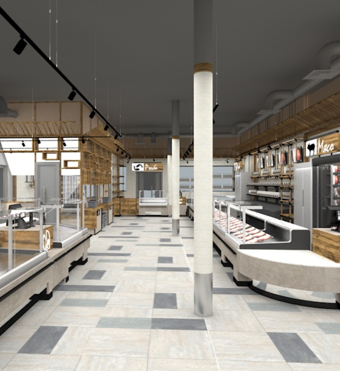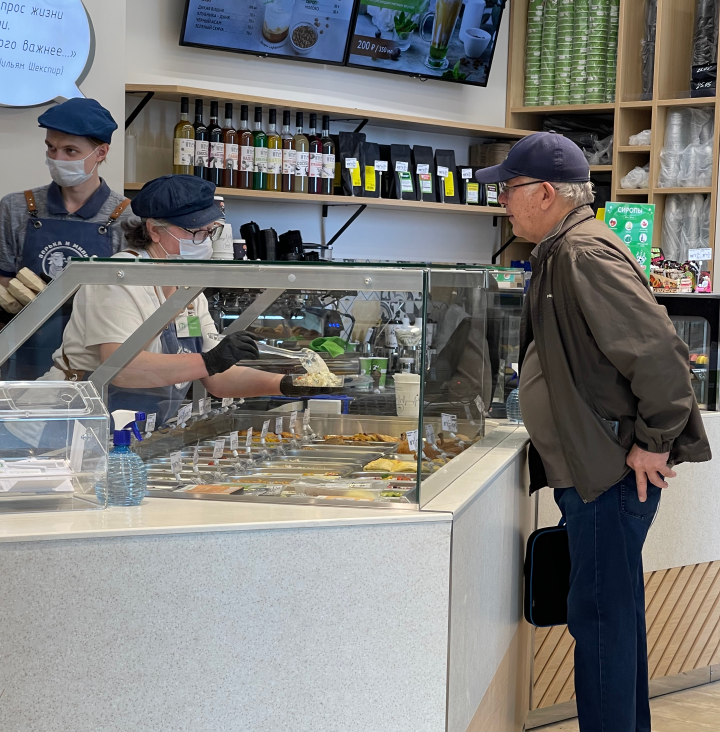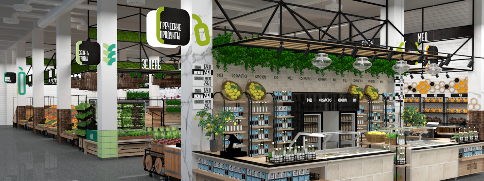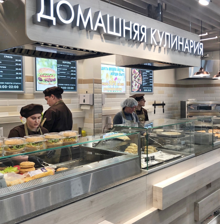 Создали остров готовой еды с зоной посадки. Остров объединяет в себе традиционную выкладку готовых блюд и открытую кухню, с широким ассортиментом fast-food.